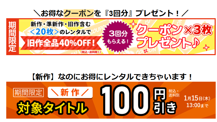 - 単品レンタル割引、送料無料クーポンなども随時発行
